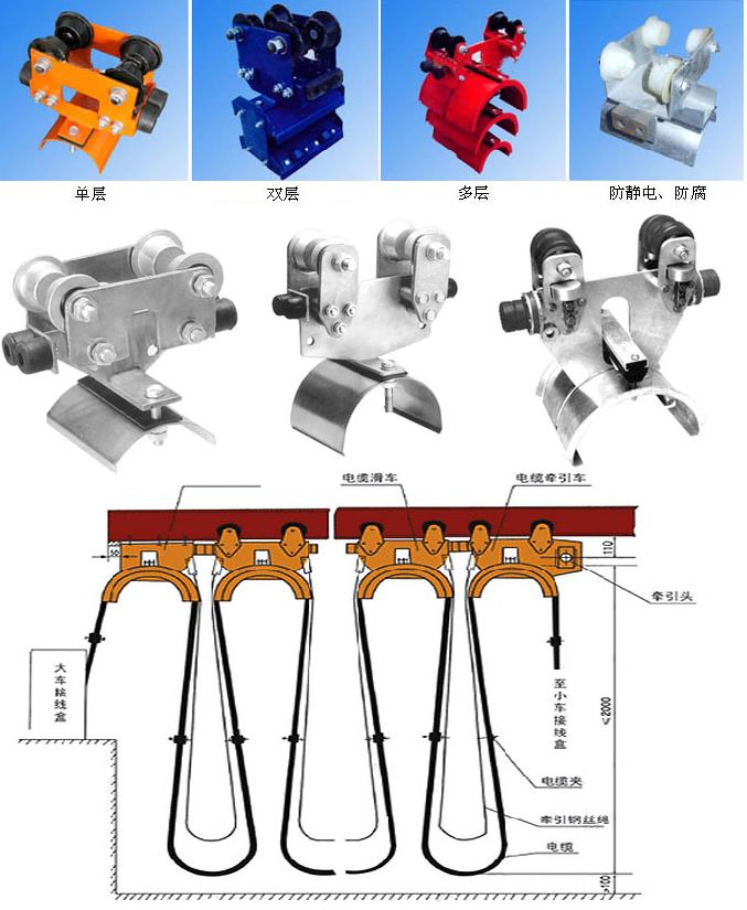 GHC系列工字鋼滑車分為中載荷型、重載荷型、和輕載荷型,因此滑車走輪為Ф80、Ф63、Ф50的三種,承載能力≤50~150kg,每類按托板層數分為單層、雙層、三層,每類中有三種形式,首端為電纜牽引車,終端為固定掛線架,中間為電纜滑車。 GHC系列工字鋼滑車安裝說明: 1、固定掛線架安裝好后,后邊應掛一擋板。 2、調整牽引頭,使小車在整個行程中不碰牽引孔的上下邊緣為好。 3、電纜長度為起重機跨度的1.2倍加8米。 4、調整牽引鋼絲繩,使其長度小于同節電纜長度,運行時由牽引鋼絲繩受力。 5、當電纜直徑不等時,電纜夾間應墊以軟橡皮, 使其外徑基本相同,以便將電纜夾緊。 6、布電纜時,應考慮兩面電纜托板受力均衡。 7、當電纜滑車為二層,三層時,要求相同。 8、滑車裝置上的雙墊圈為調整墊圈,當導軌不合適時,把墊圈放在固定板的內側,以調整軌距的寬窄,出廠時按導軌為I 100*68*4.5、I 120*74*5、I140*80*5、I 160*88*6制造。非標滑車按圖紙加工制作。 GHC系列工字鋼滑車規格參數: