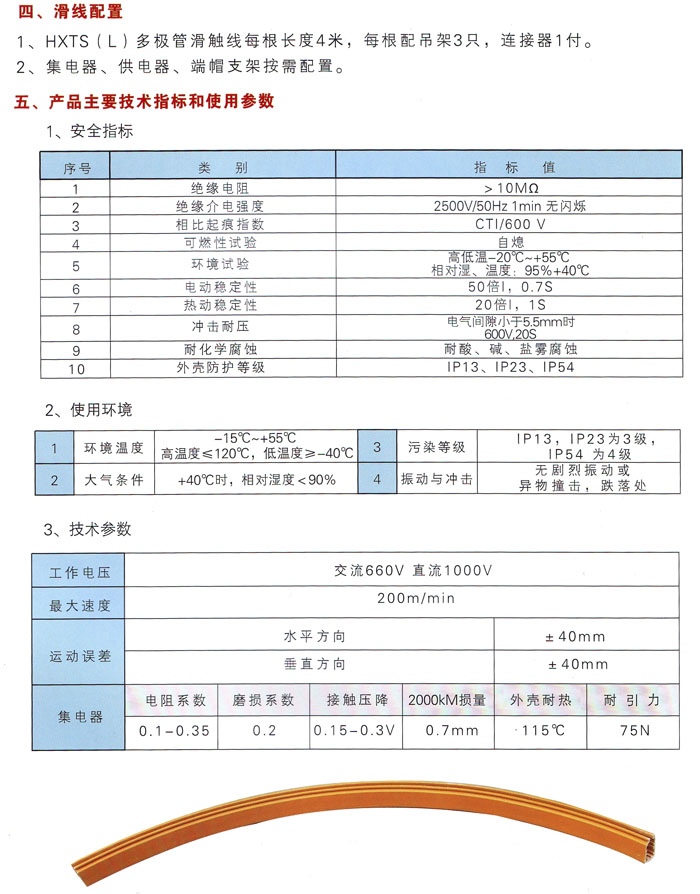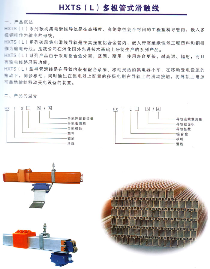 注:1、滑觸線標準長度:4m、6m。 2、滑觸線極數:3-6極。 3、HXTS與HXTL相同,前者外殼為塑料,后者外殼為鋁合金。